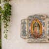 Hand-painted on canvas with a wood frame. Hook at the back for hanging